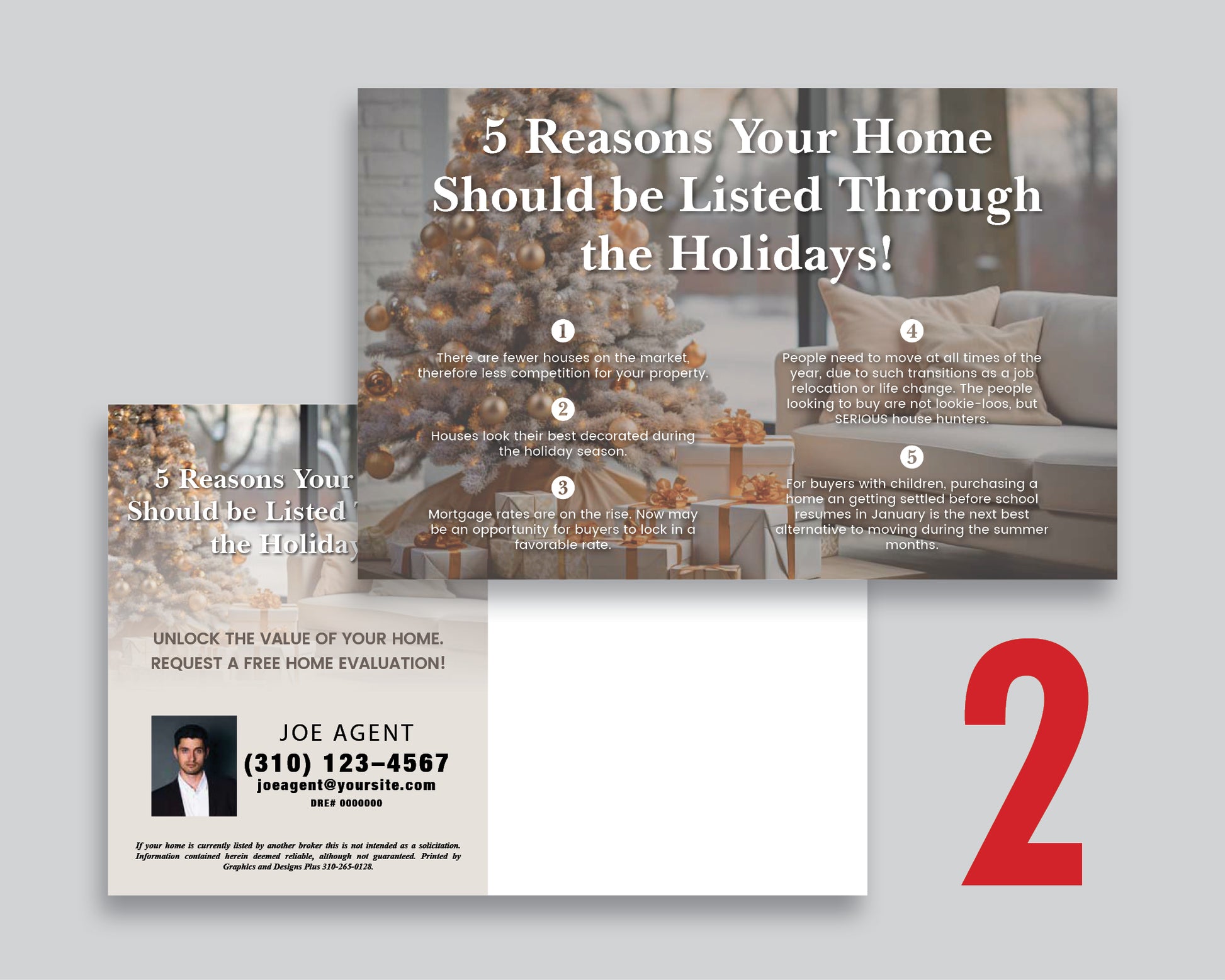 📝 These postcards emphasize benefits like motivated buyers, reduced competition, and a warm, inviting atmosphere for showings. Sellers see why listing during the holidays works in their favor—attracting more interest and leading to faster sales.